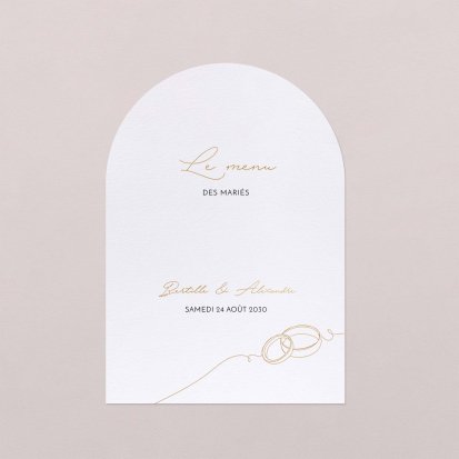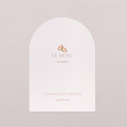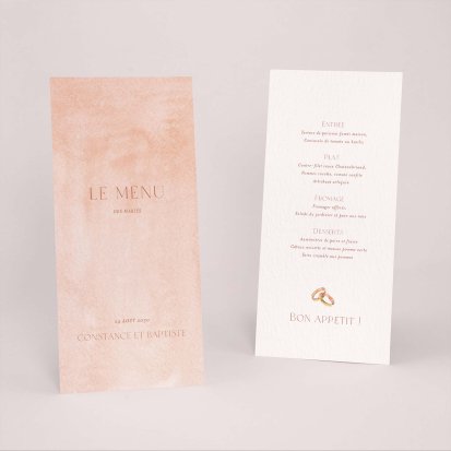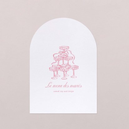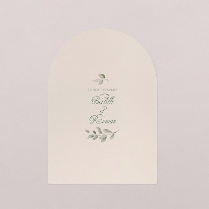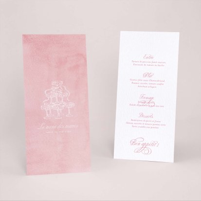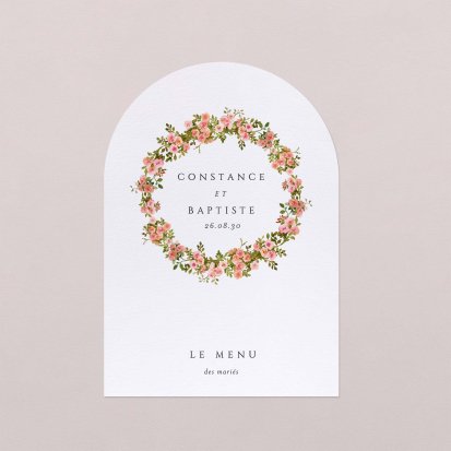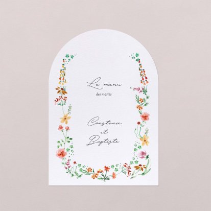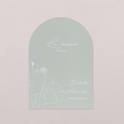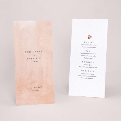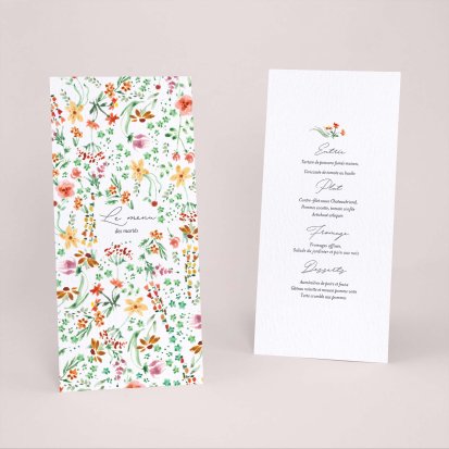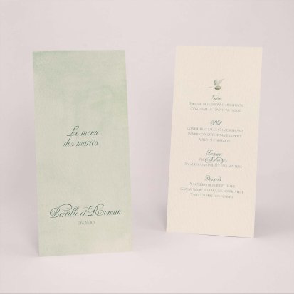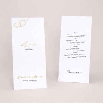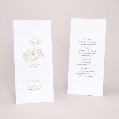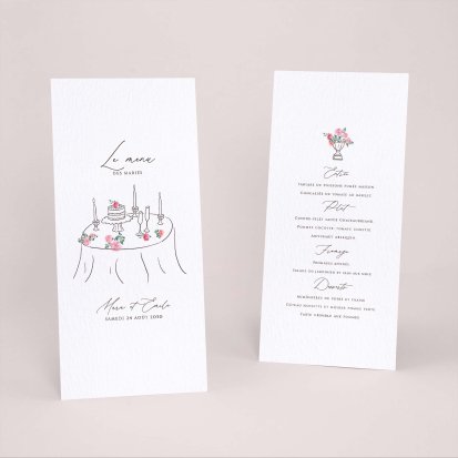 Faites-le imprimer sur nos menus assortis à votre faire-part ! Posés sur chacune de vos tables, ils viendront compléter votre décoration et vos invités repartiront avec un souvenir de ce merveilleux repas. Nous vous conseillons de le placer joliment au centre de l'assiette accompagné du marque-place.