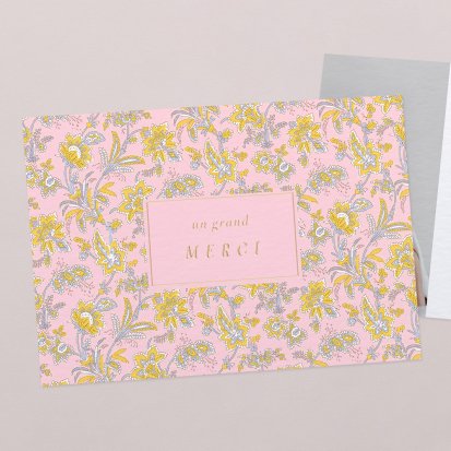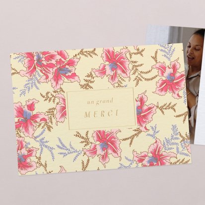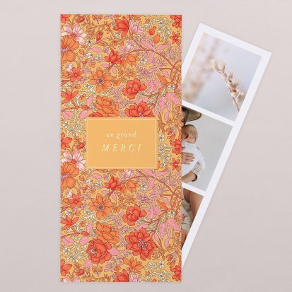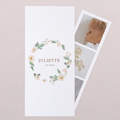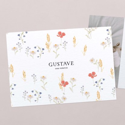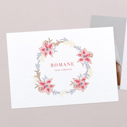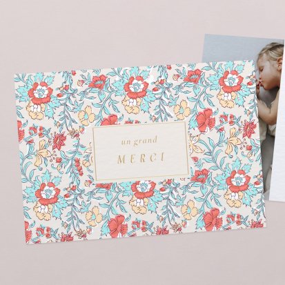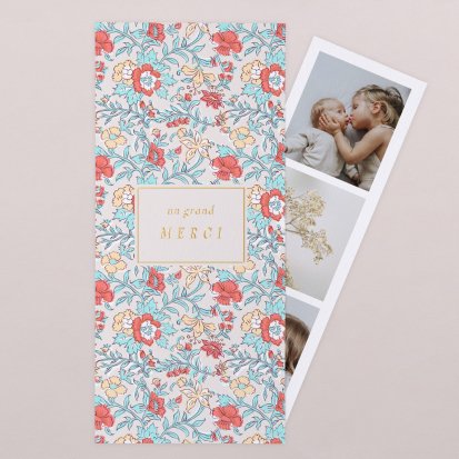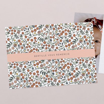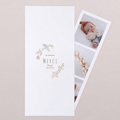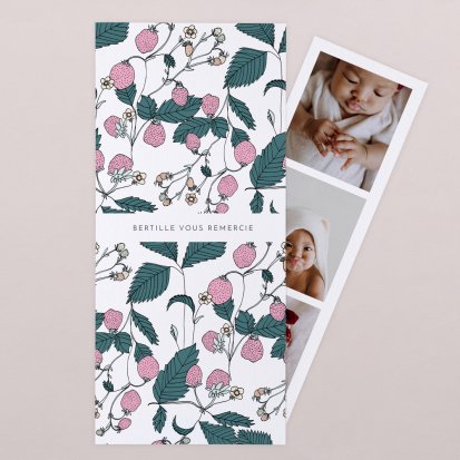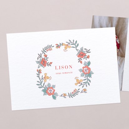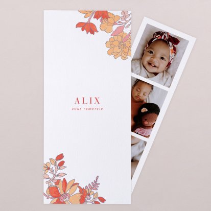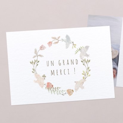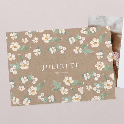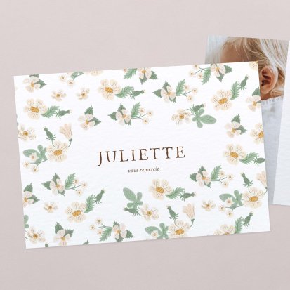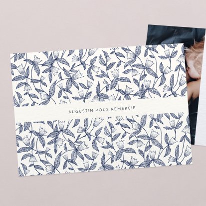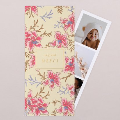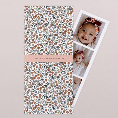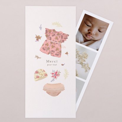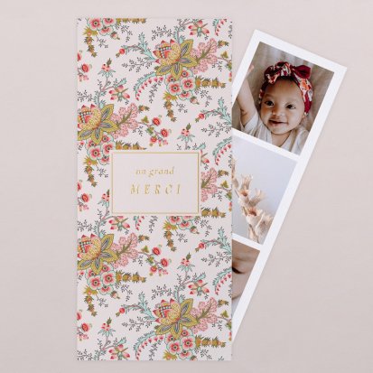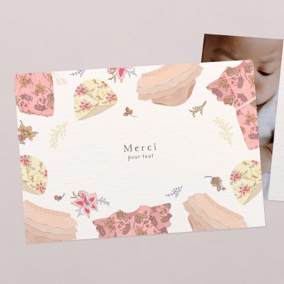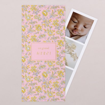 La douceur de la couleur rose, de jolis motifs végétaux champêtres, des fleurs illustrées au style liberty ou une délicate esquisse de votre enfant : trouvez votre bonheur parmi une multitude de modèles de remerciements de naissance pour partager votre bonheur avec vos proches.
