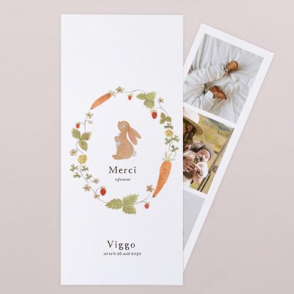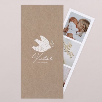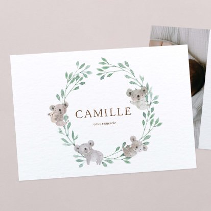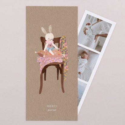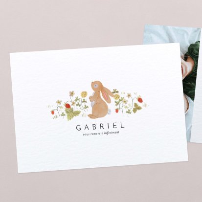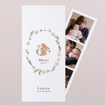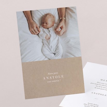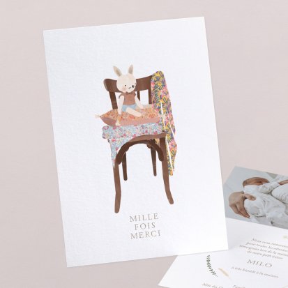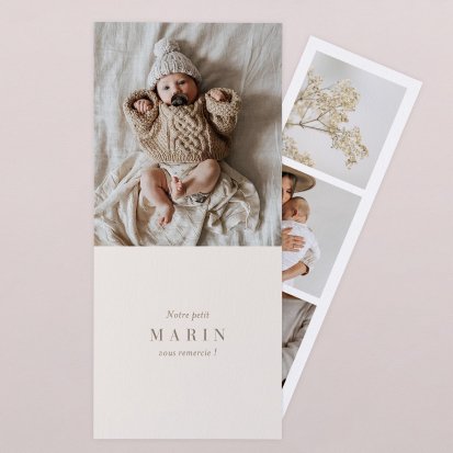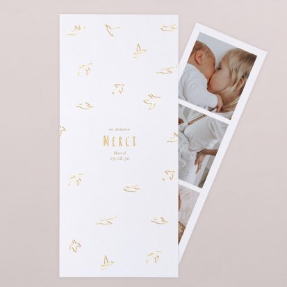 Certains faire-part possèdent des cartes de remerciements assorties : c'est une solution idéale pour gagner du temps lors de votre choix. Elle vous permet également de conserver une certaine cohérence graphique dans toute votre papeterie naissance.