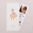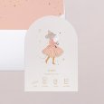 Sur le faire-part de naissance Ballerine, une adorable souris vêtue d'un tutu délicat et de chaussons de danse soulève gracieusement une oie. Les couleurs pastel douces et les détails ludiques de ce faire-part capturent parfaitement la joie de l'arrivée d'un nouveau-né.