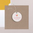 Ce faire-part de naissance se présente sous la forme d'une carte carrée pliée, agrémentée d'une étiquette ronde perforée.