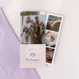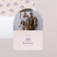 Intitulé Pizy, ce faire-part de naissance se distingue par sa simplicité élégante. Photo de bébé et détails clés de sa naissance sont mis en lumière, son prénom dévoilé dans un joli lettrage mauve. Le motif signature de Gamin Gamine, un petit chiot, s'invite sur cette création, adorable messager de l'arrivée de bébé.