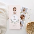 Sur le faire-part Rosaire, l’initiale du prénom de votre enfant est au centre de toutes les attentions. Délicates notes végétales et petite fille en robe de cérémonie complètent cette adorable invitation de communion.