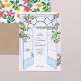 Sur le faire-part de mariage Lamartine, une superbe porte vitrée aux formes arquées dévoile les détails clés de votre beau jour. Un modèle aux délicates aquarelles fleuries et vitaminées, pour une union romantique à souhait.