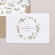 Une sublime couronne de fleurs blanches orne le faire-part de baptême Rosa blanca. Un modèle plein de fraîcheur, parfait pour une cérémonie printanière ou estivale.