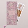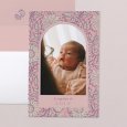 Ce faire-part de baptême se présente sous la forme d'une carte au format portrait, composée d'un volet central et de deux volets latéraux mobiles. À leur ouverture, ces derniers dévoilent les détails clés du baptême de votre enfant. Ils peuvent être maintenus fermés grâce à un joli ruban (au choix et en supplément).