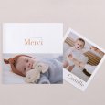 Cette carte de remerciements s'accompagne d'un cadeau glissé à l'intérieur : un polaroid (non magnétisé) de votre nouveau-né, qu'ils pourront conserver en souvenir, afficher selon leur inspiration, utiliser comme marque-page...
